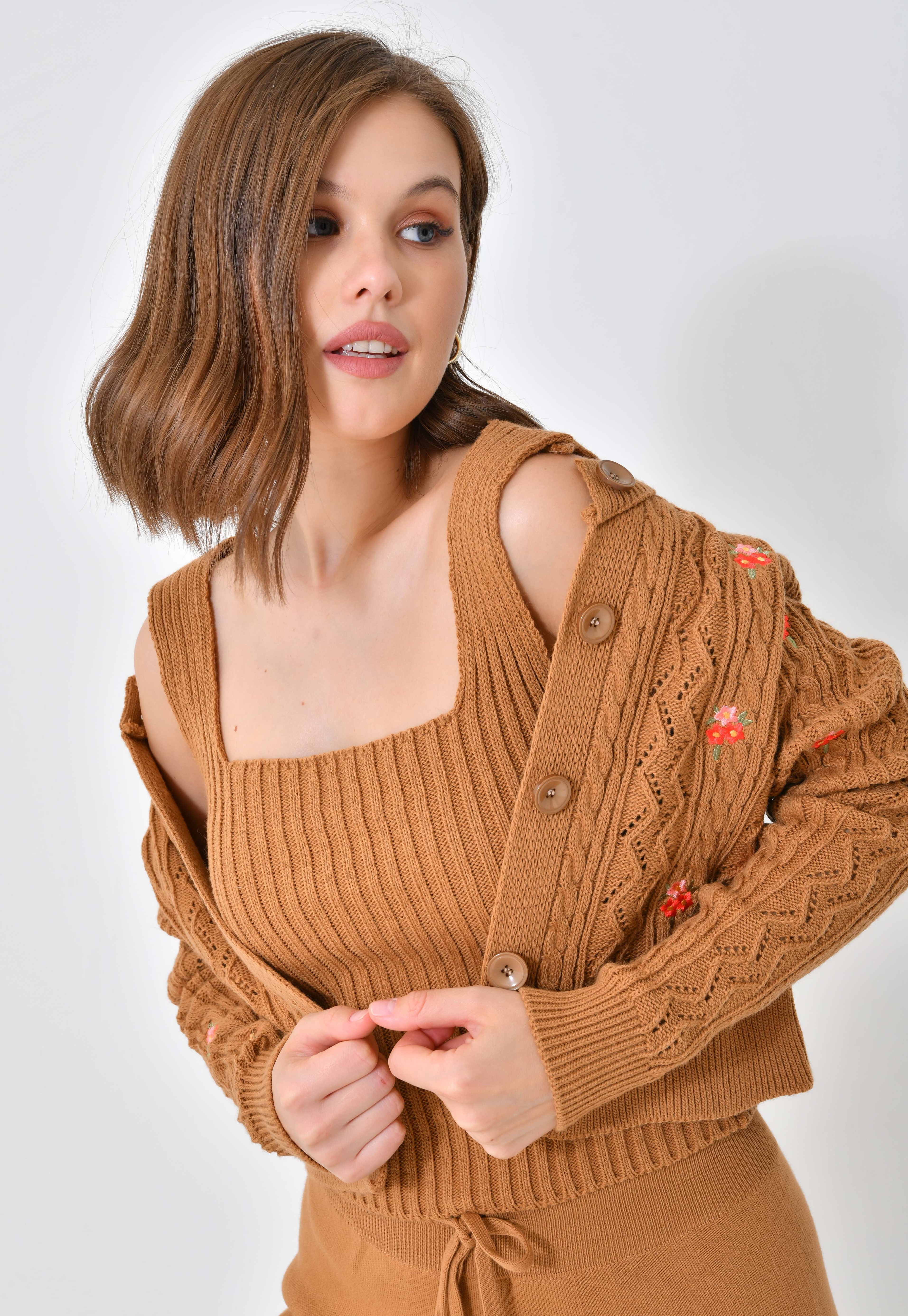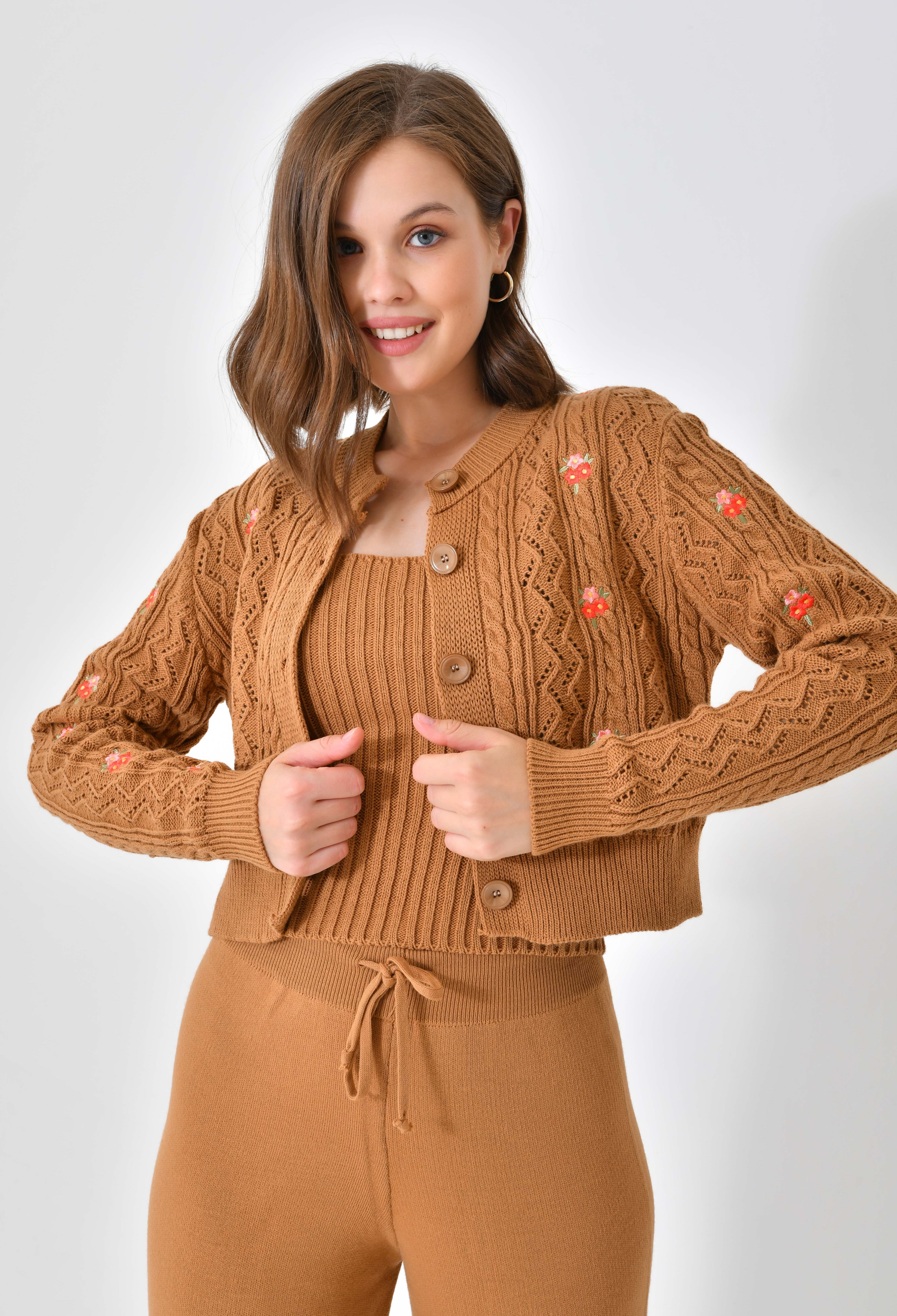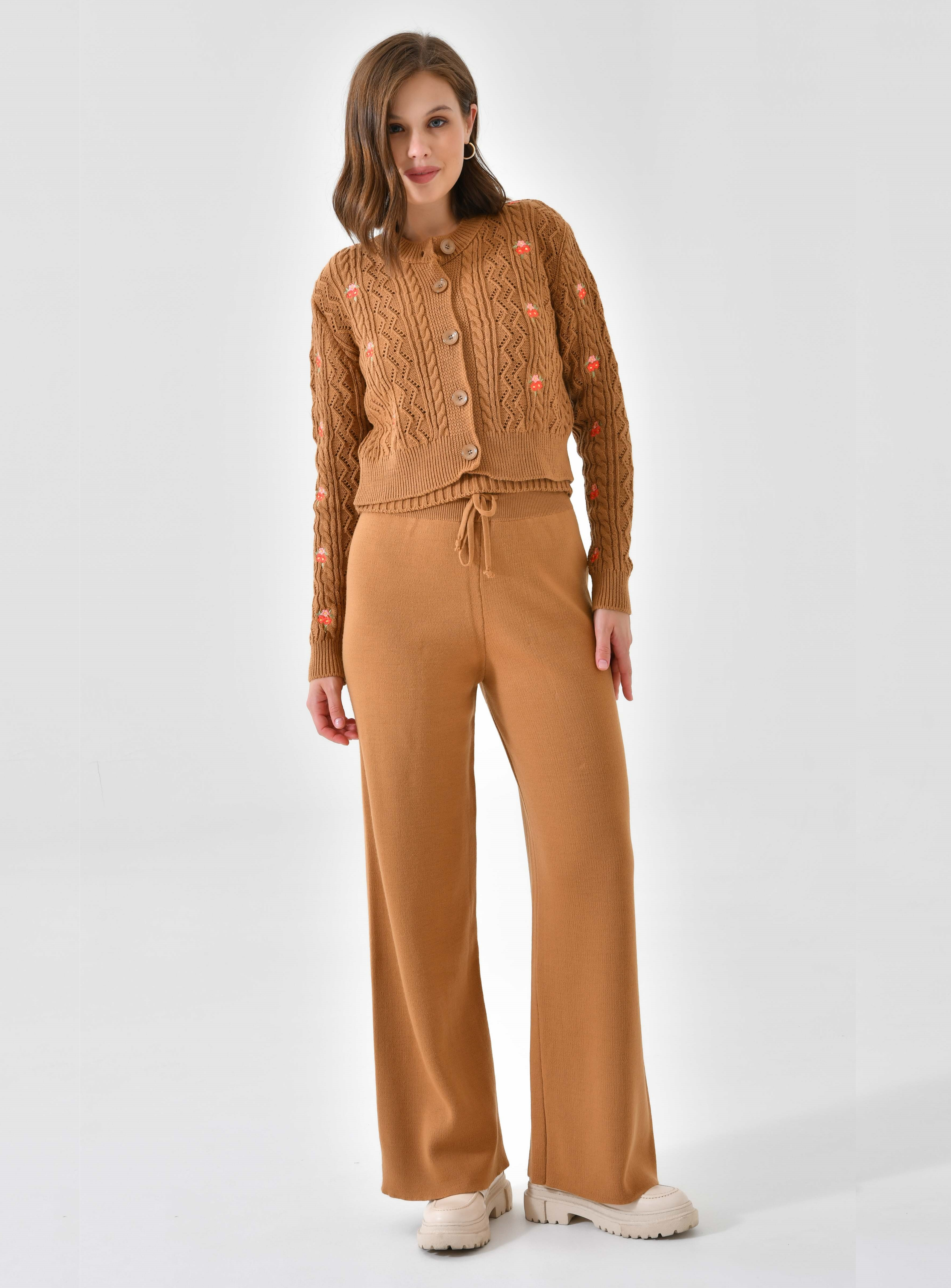 Ana Sayfa Genel Ana ekran Yeni Nakışlı Camel 3 Parça Triko Takım