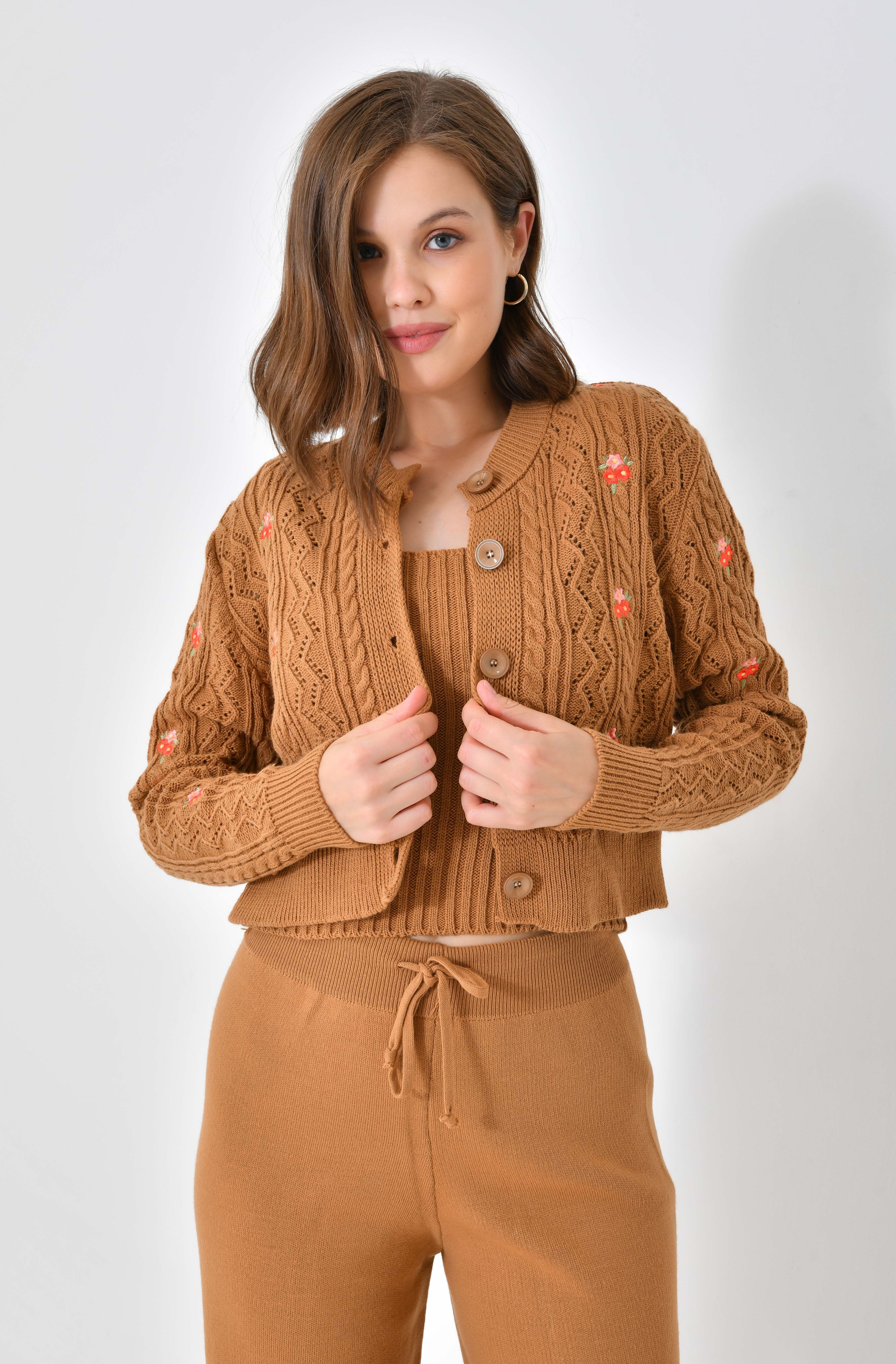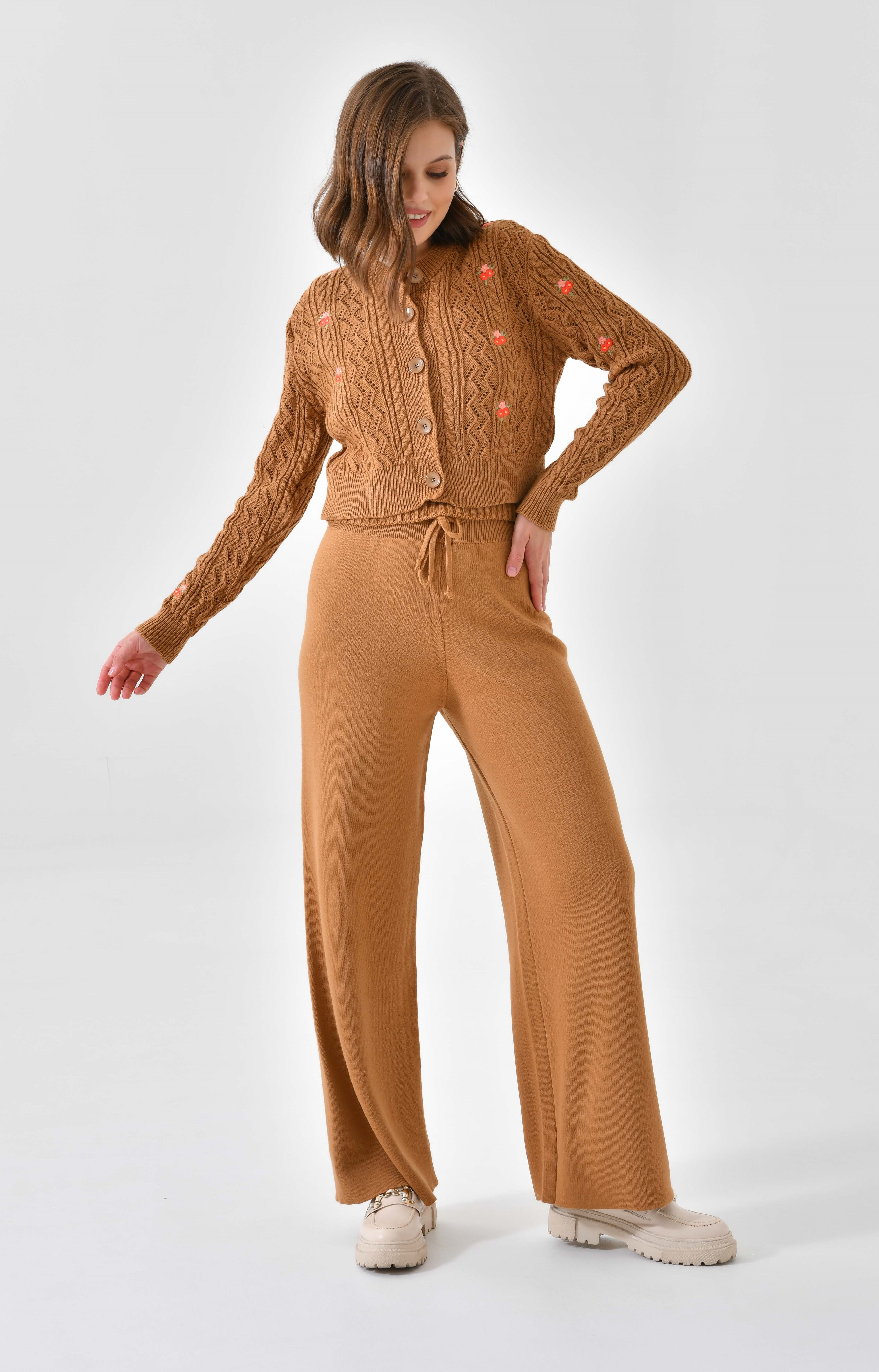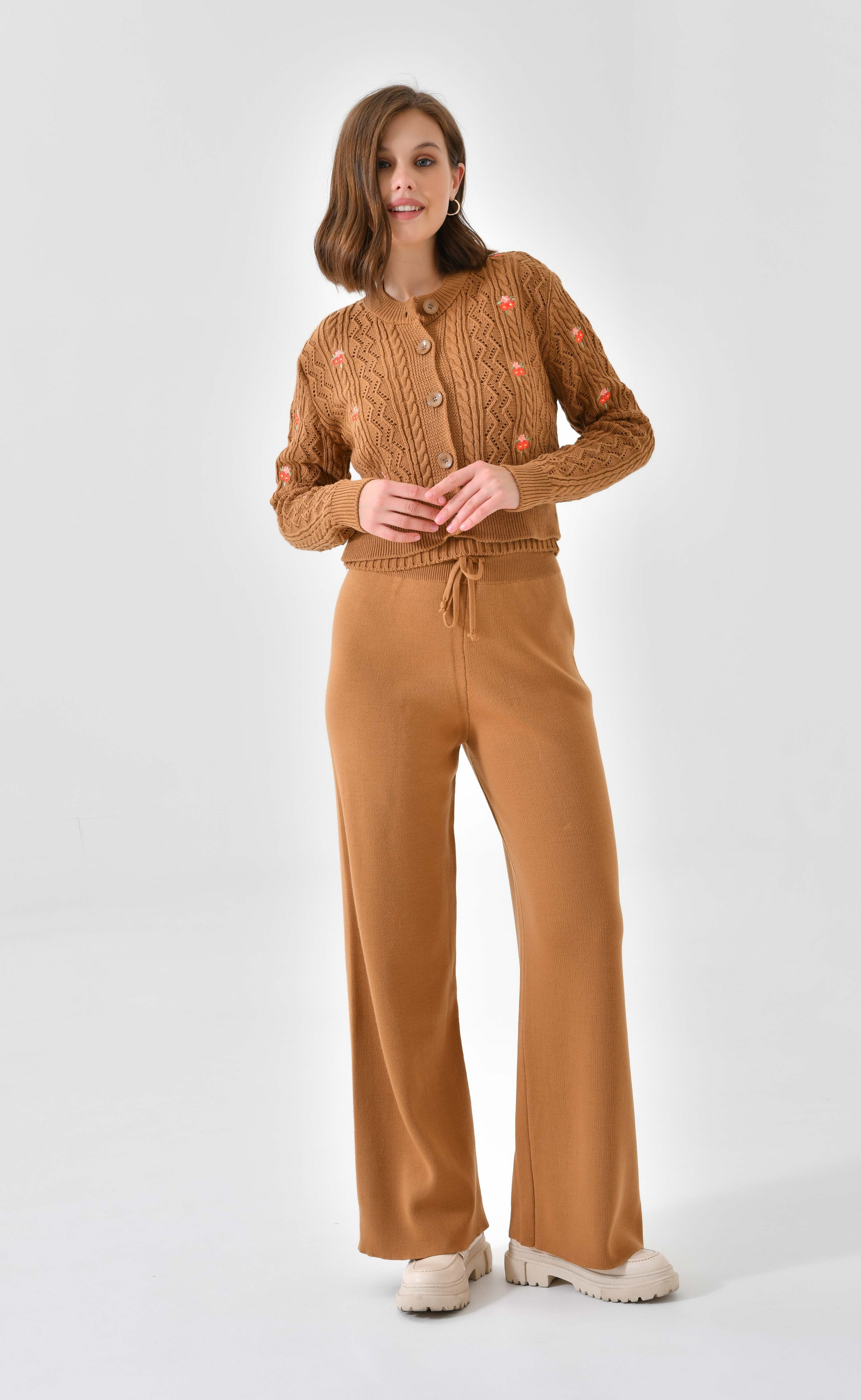 Ana Sayfa Genel Ana ekran Yeni Nakışlı Camel 3 Parça Triko Takım