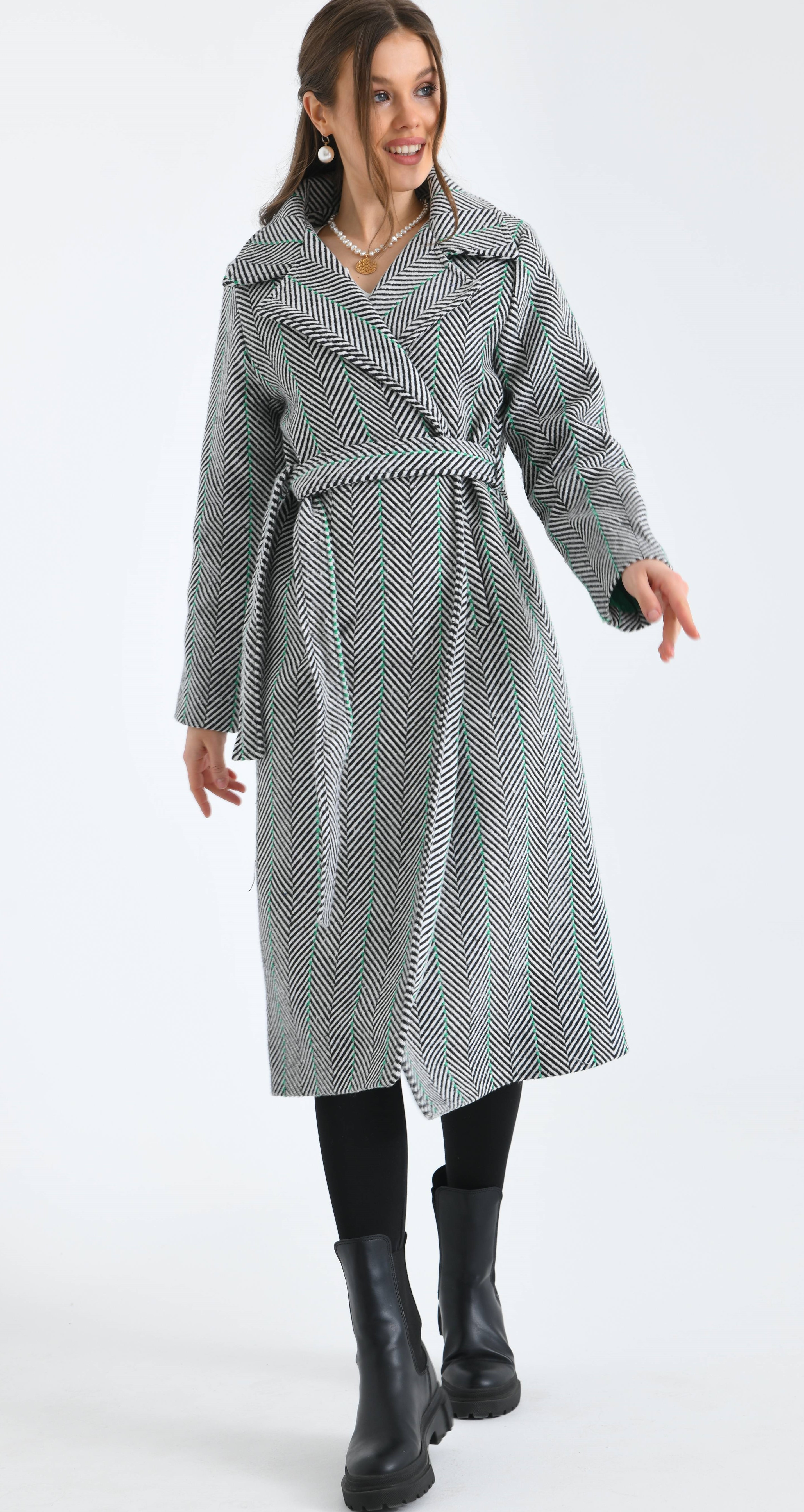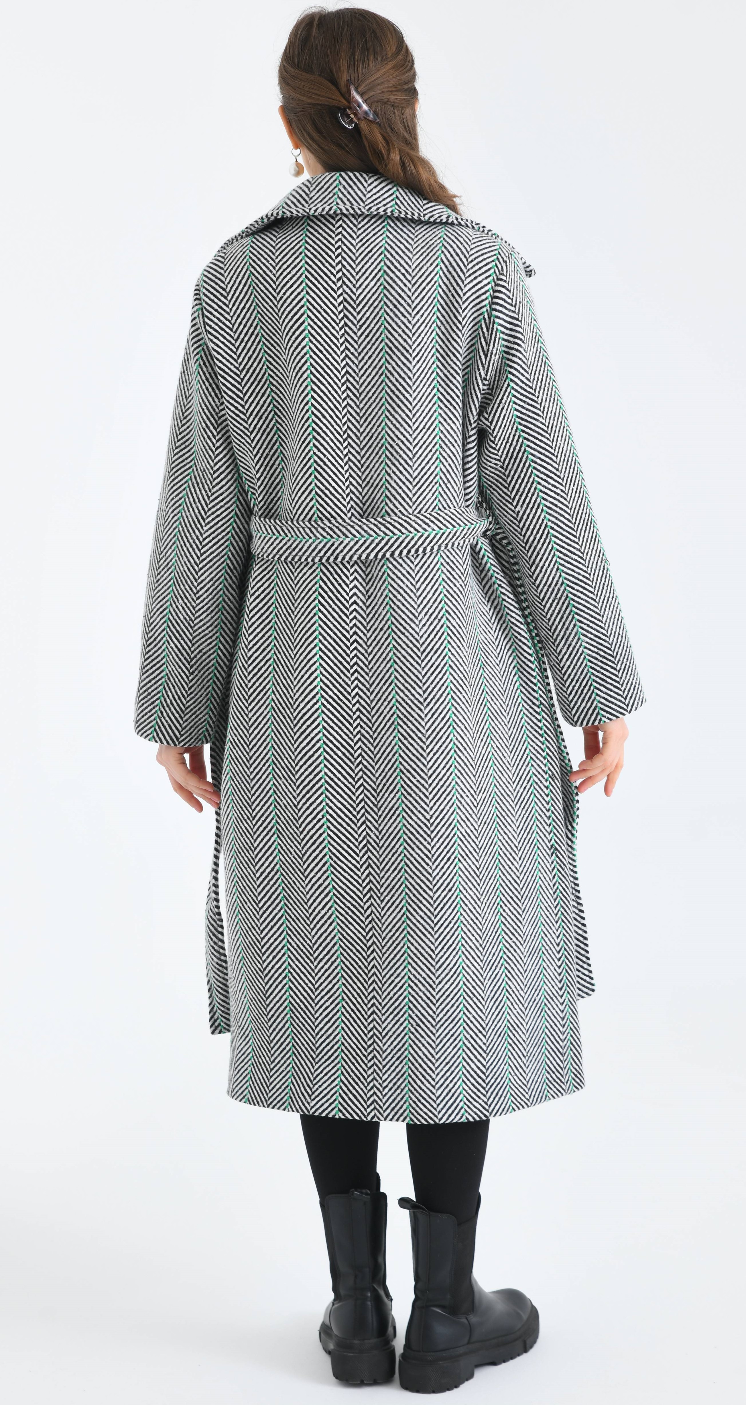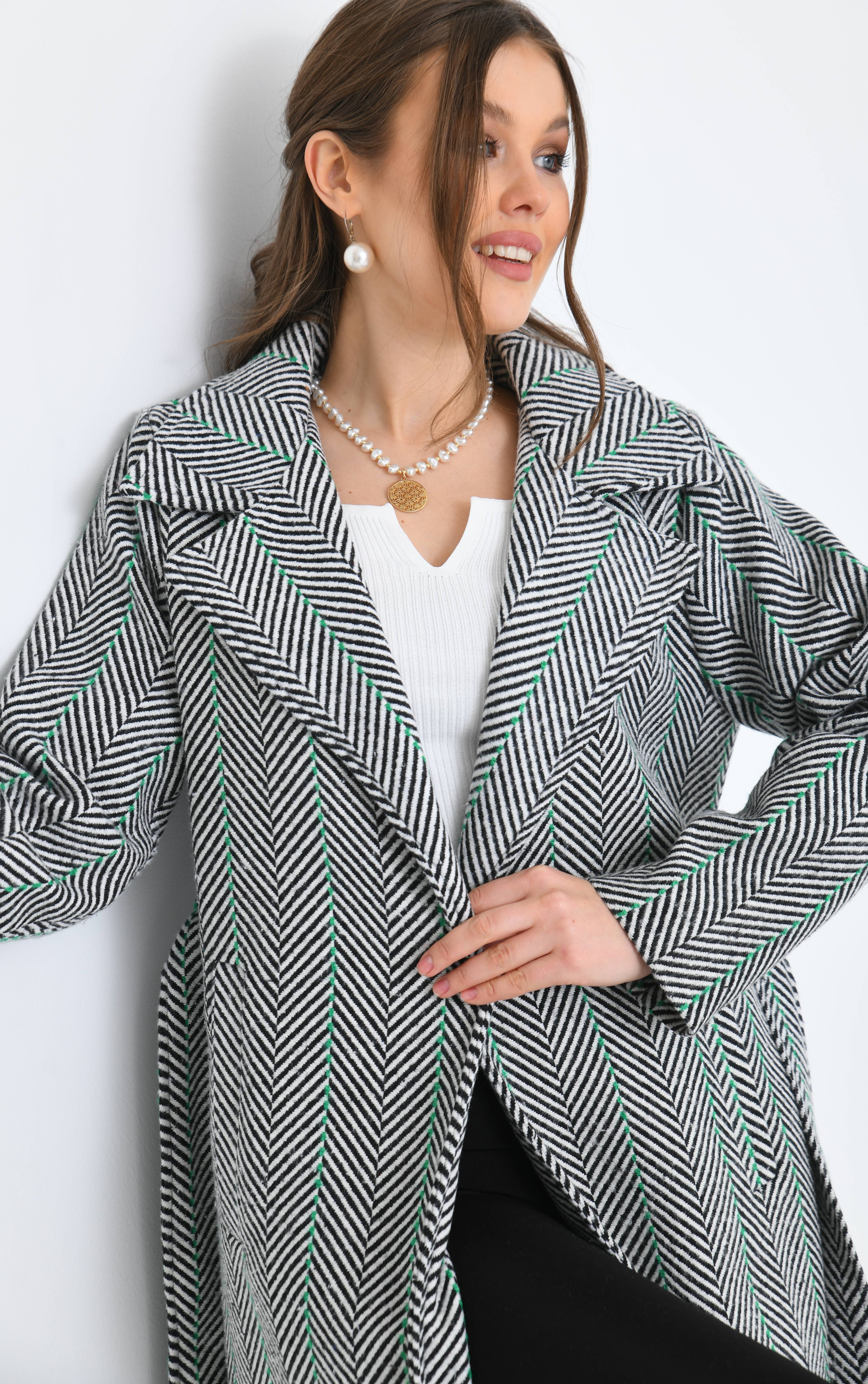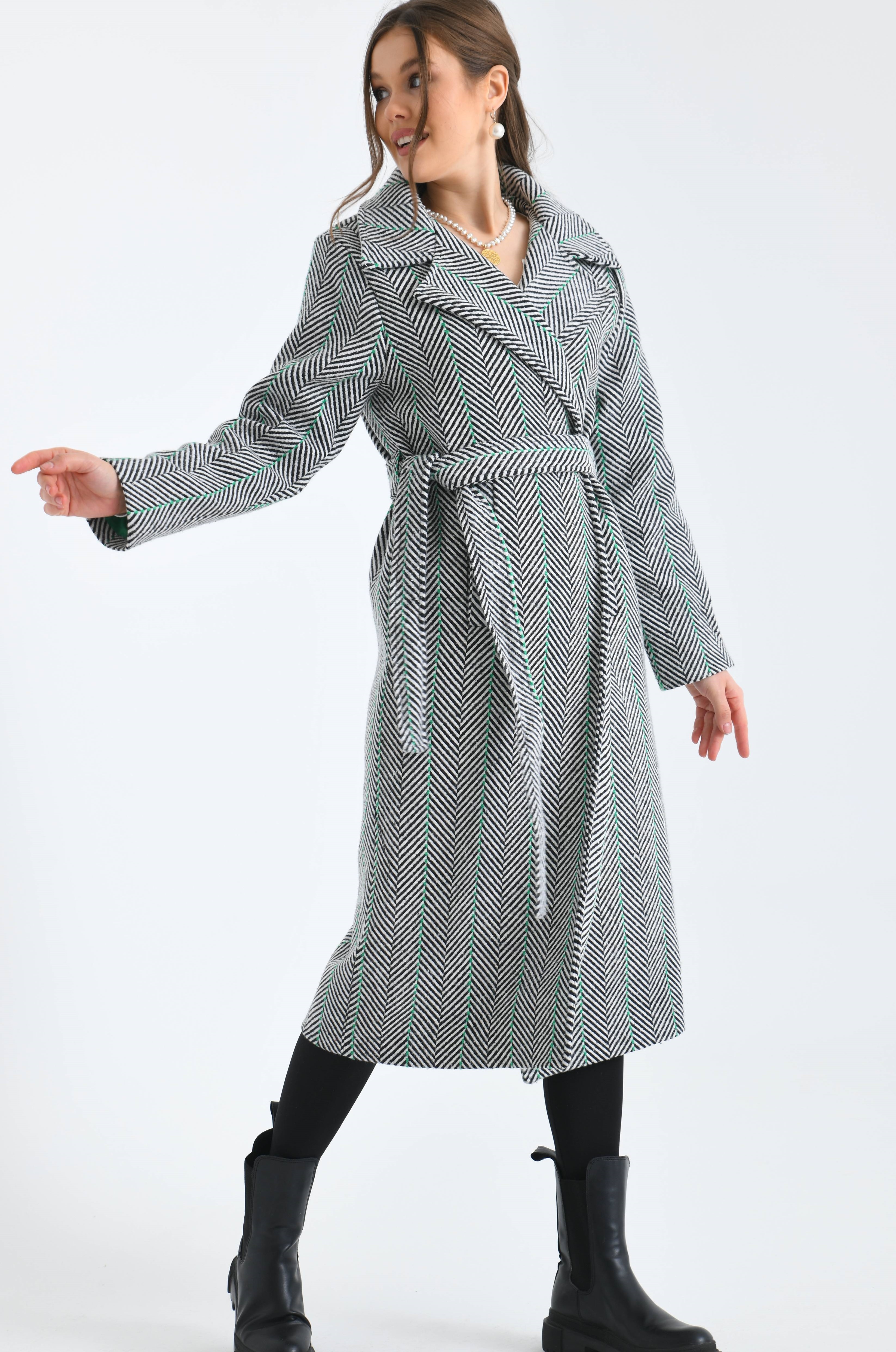 Kılçık Desenli Kemerli Cepli Yeşil Çizgili İçi Astarlı Kaşe Kaban
