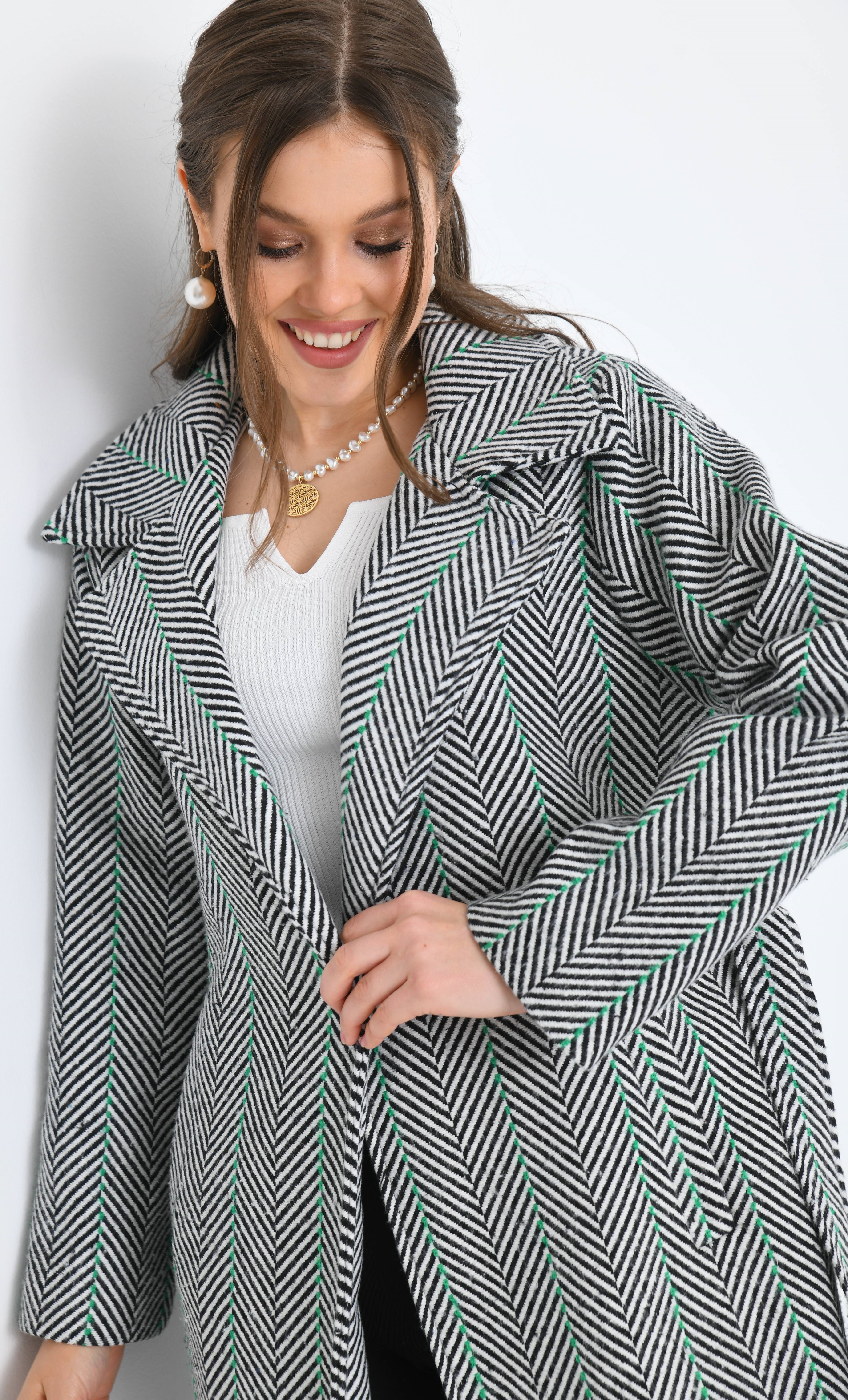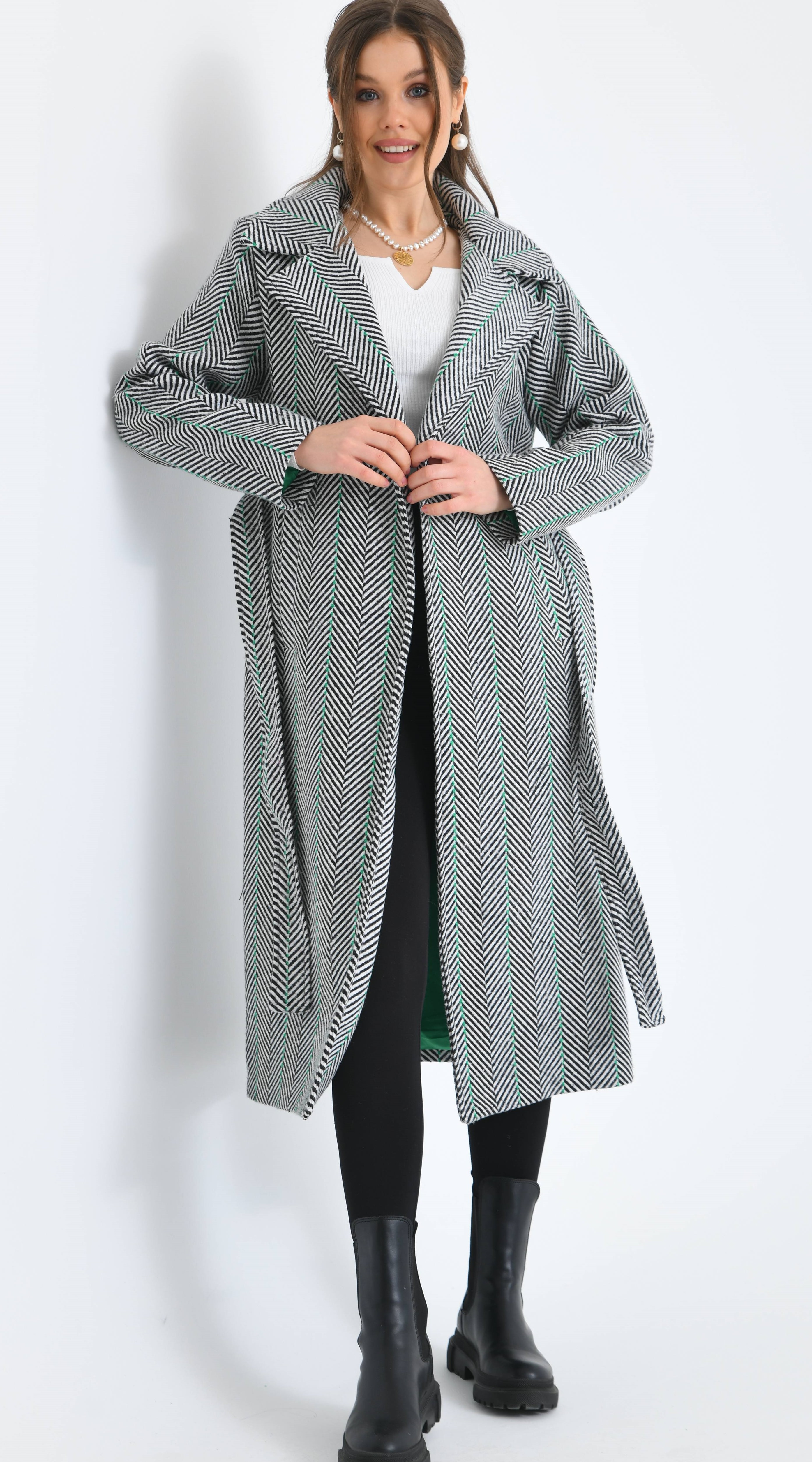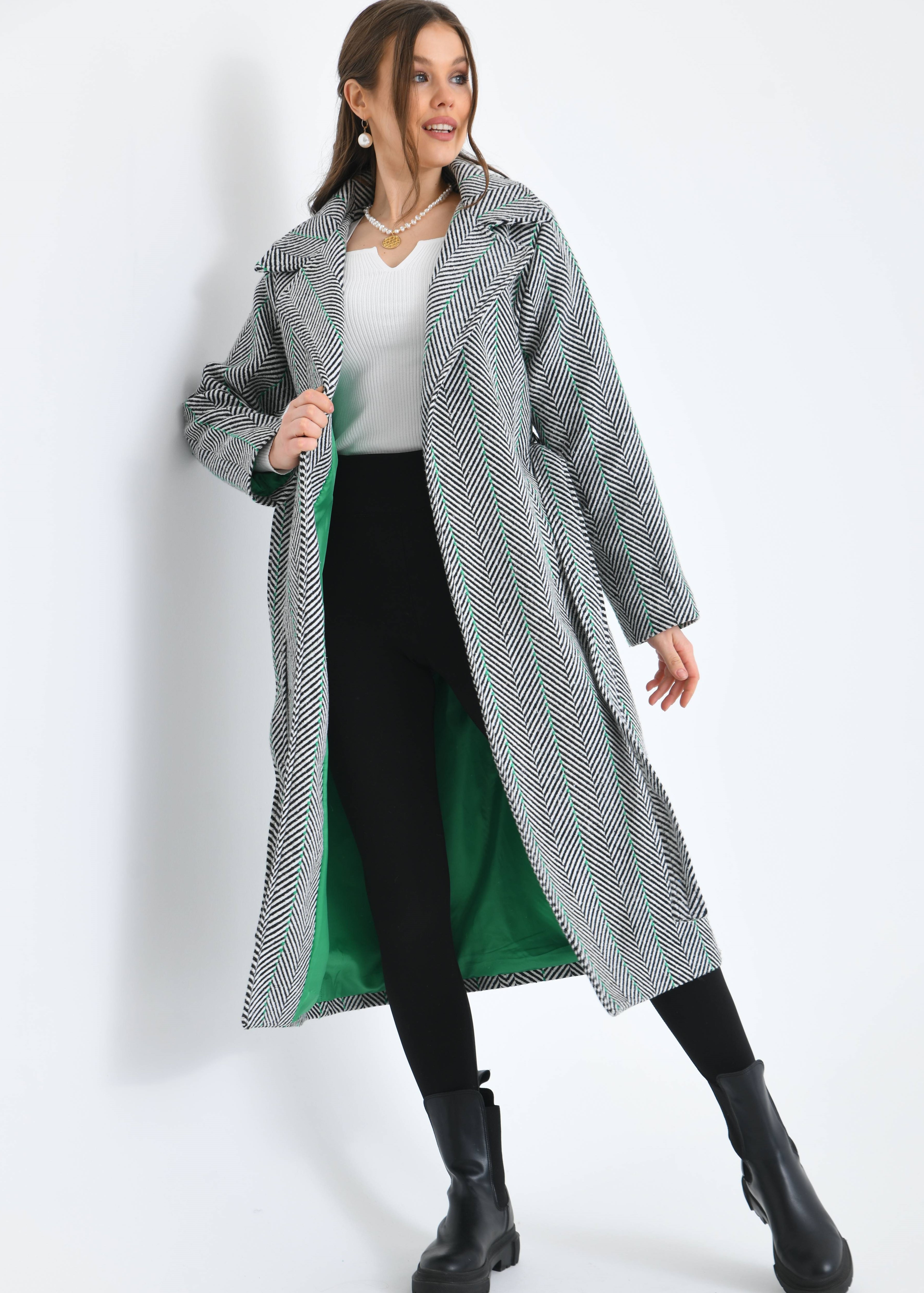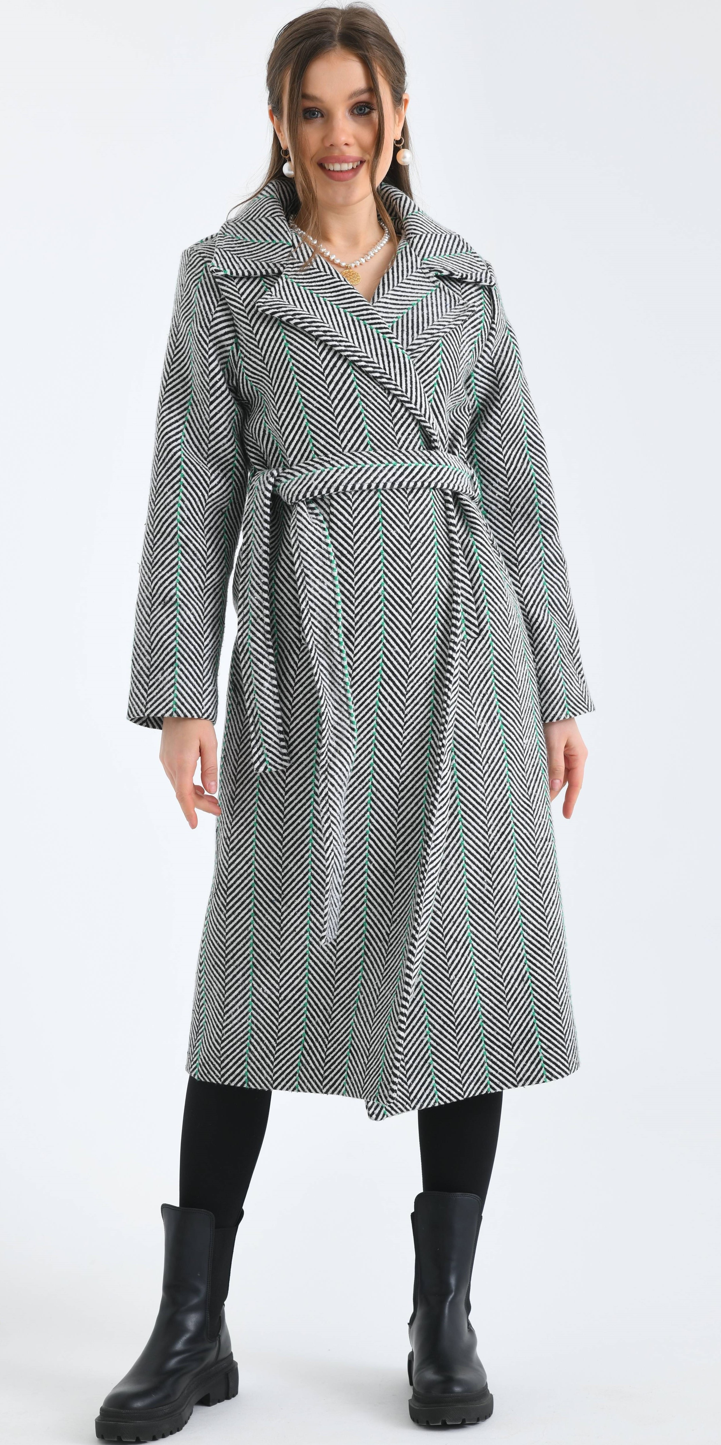 Kılçık Desenli Kemerli Cepli Yeşil Çizgili İçi Astarlı Kaşe Kaban