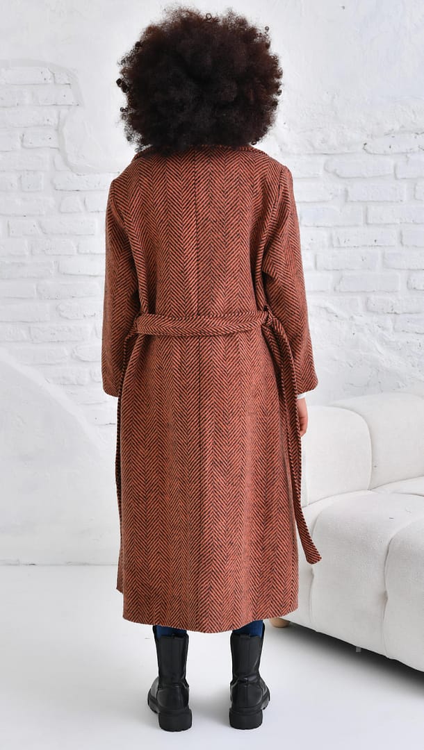Çizgili Balık Sırtı Desenli Kiremit Rengi Kemerli Cepli İçi Astarlı Uzun Kaşe Kaban
