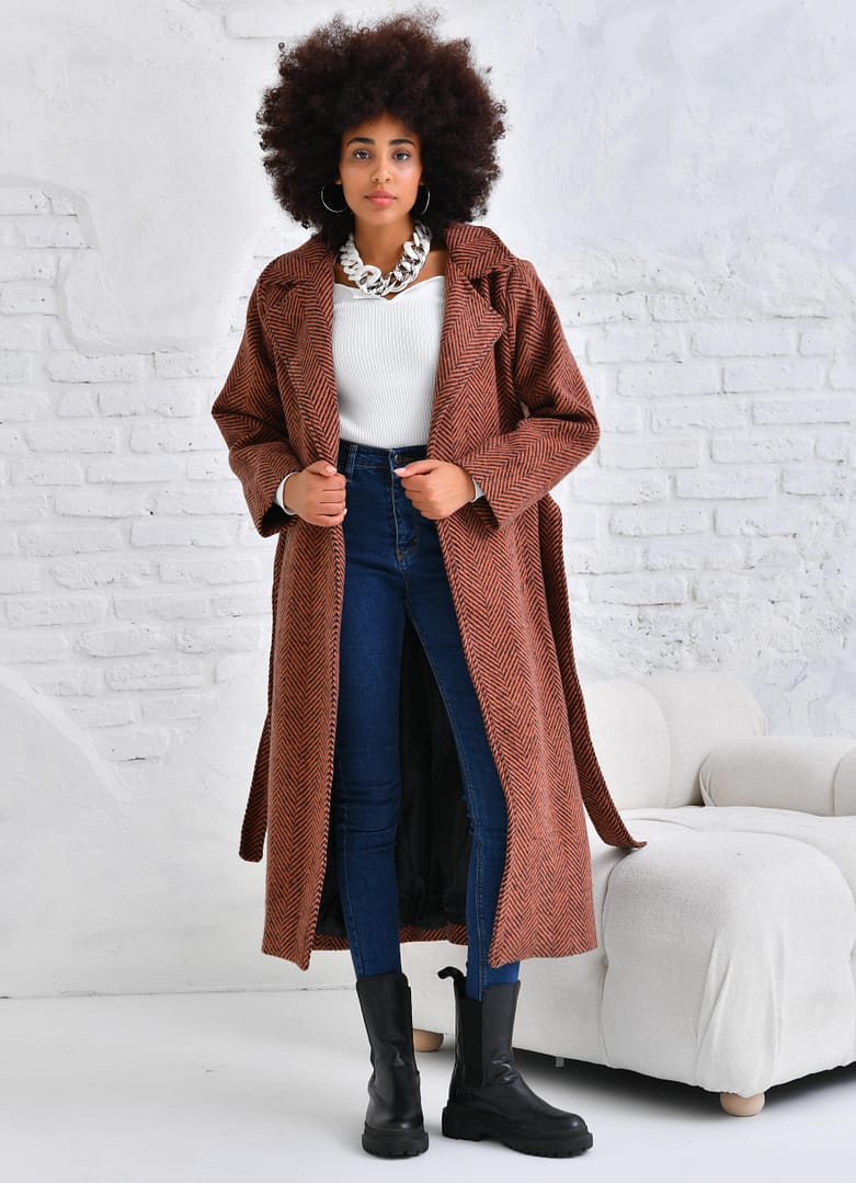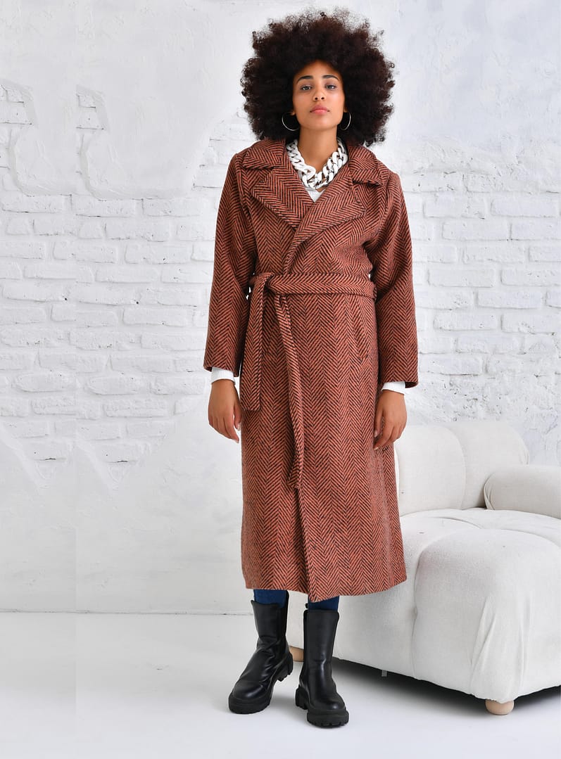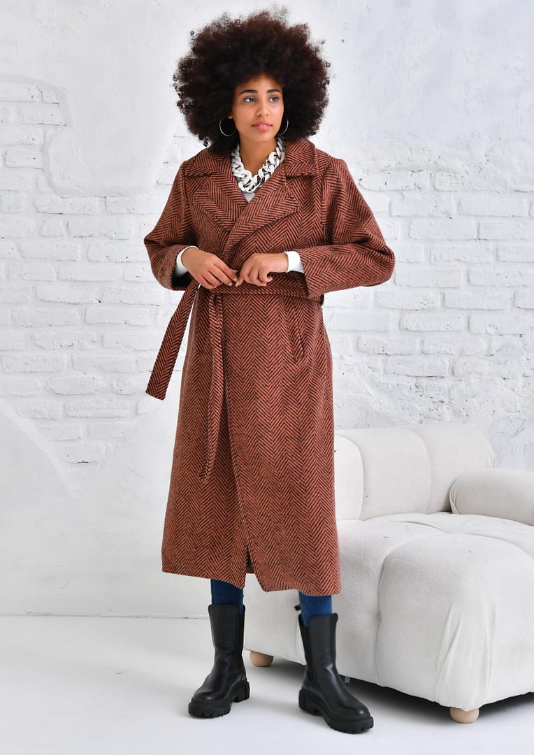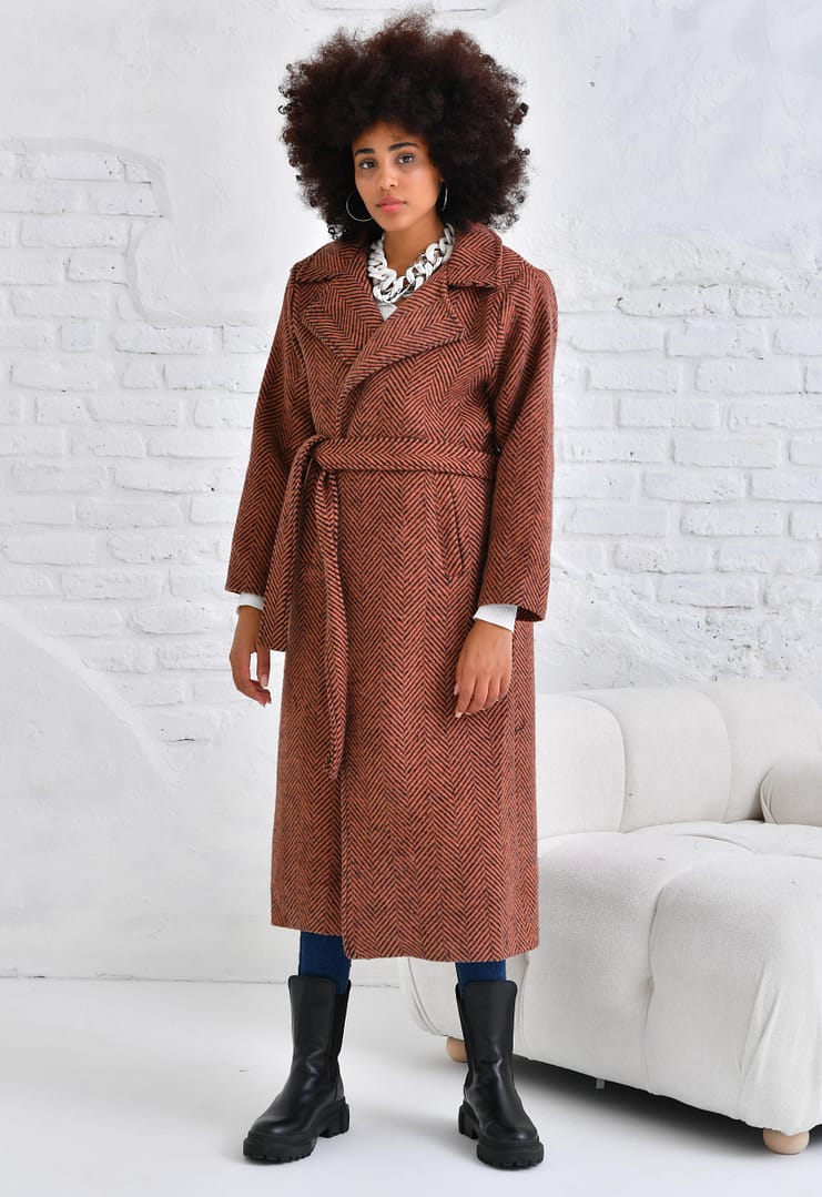 Ana Sayfa Genel Ana ekran Outdoor Çizgili Balık Sırtı Desenli Kiremit Rengi Kemerli Cepli İçi Astarlı Uzun Kaşe Kaban