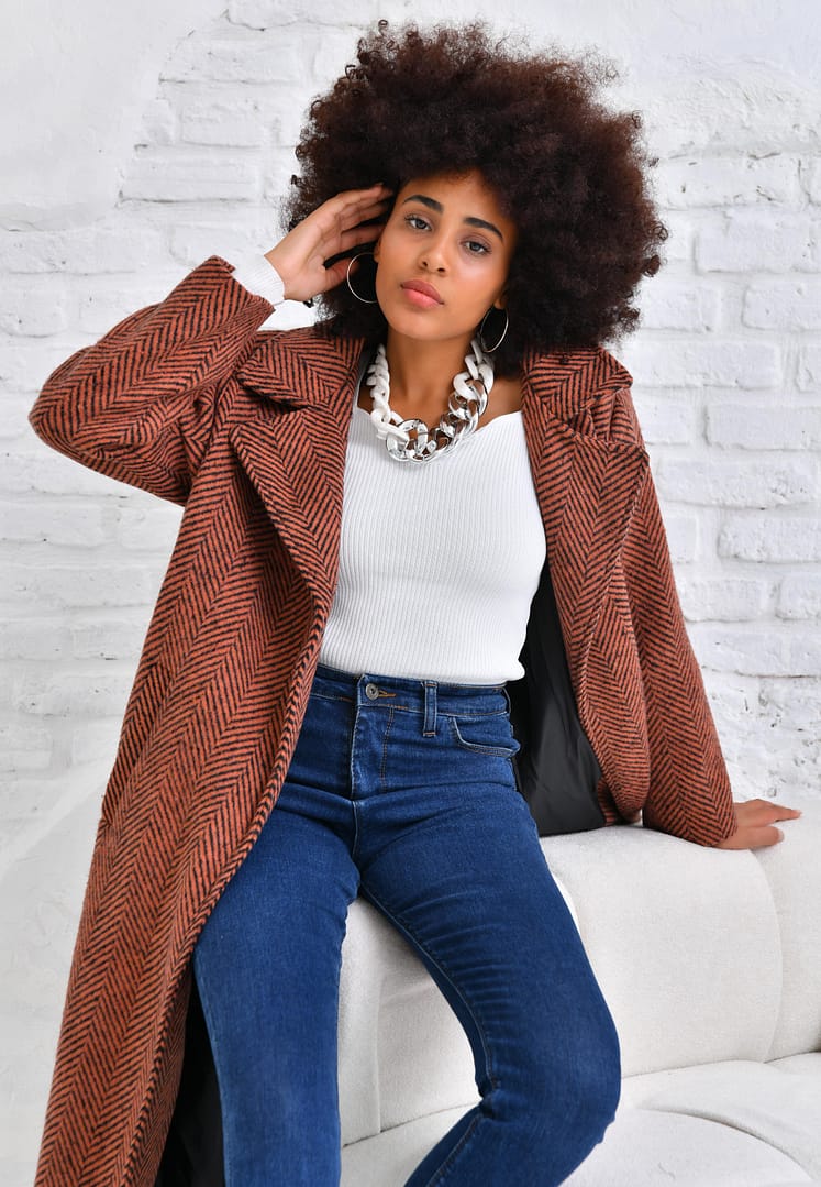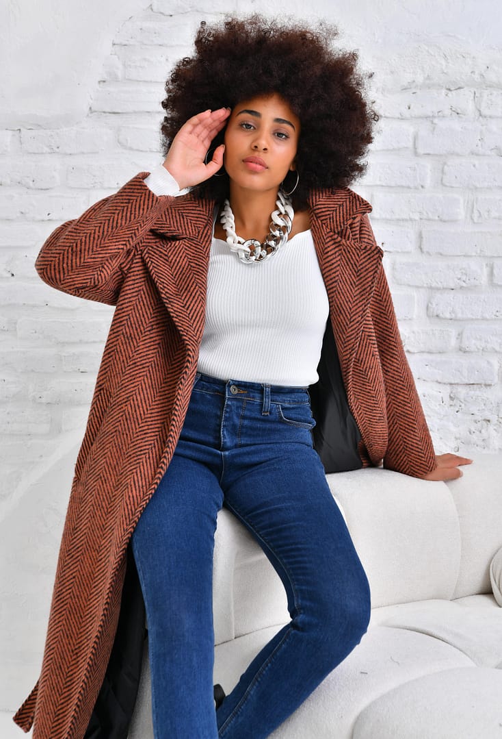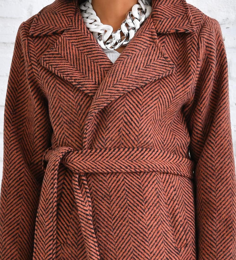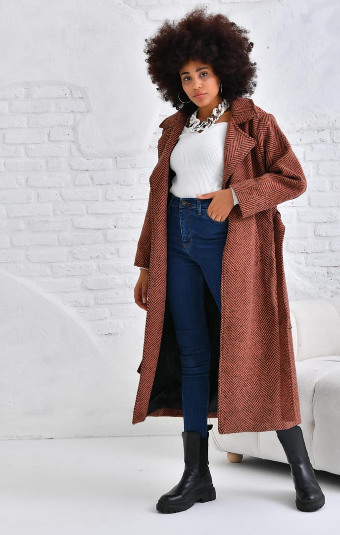 Ana Sayfa Genel Ana ekran Outdoor Çizgili Balık Sırtı Desenli Kiremit Rengi Kemerli Cepli İçi Astarlı Uzun Kaşe Kaban